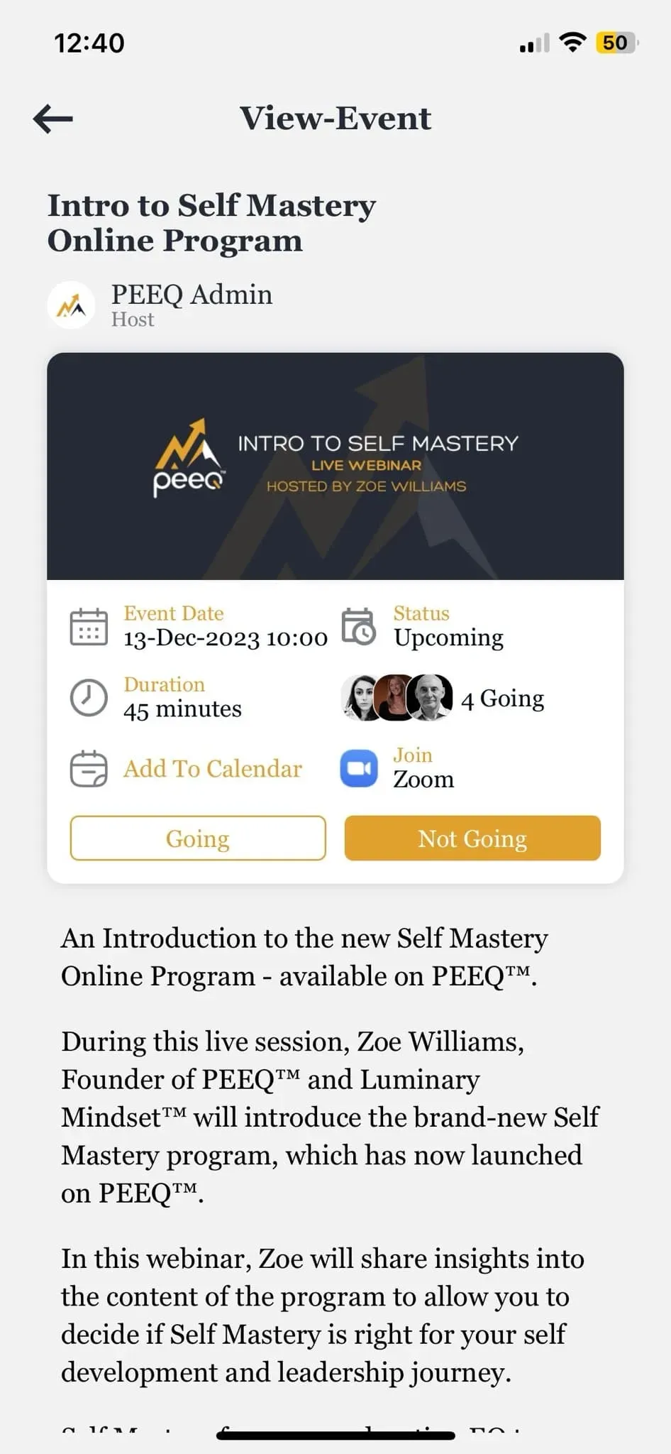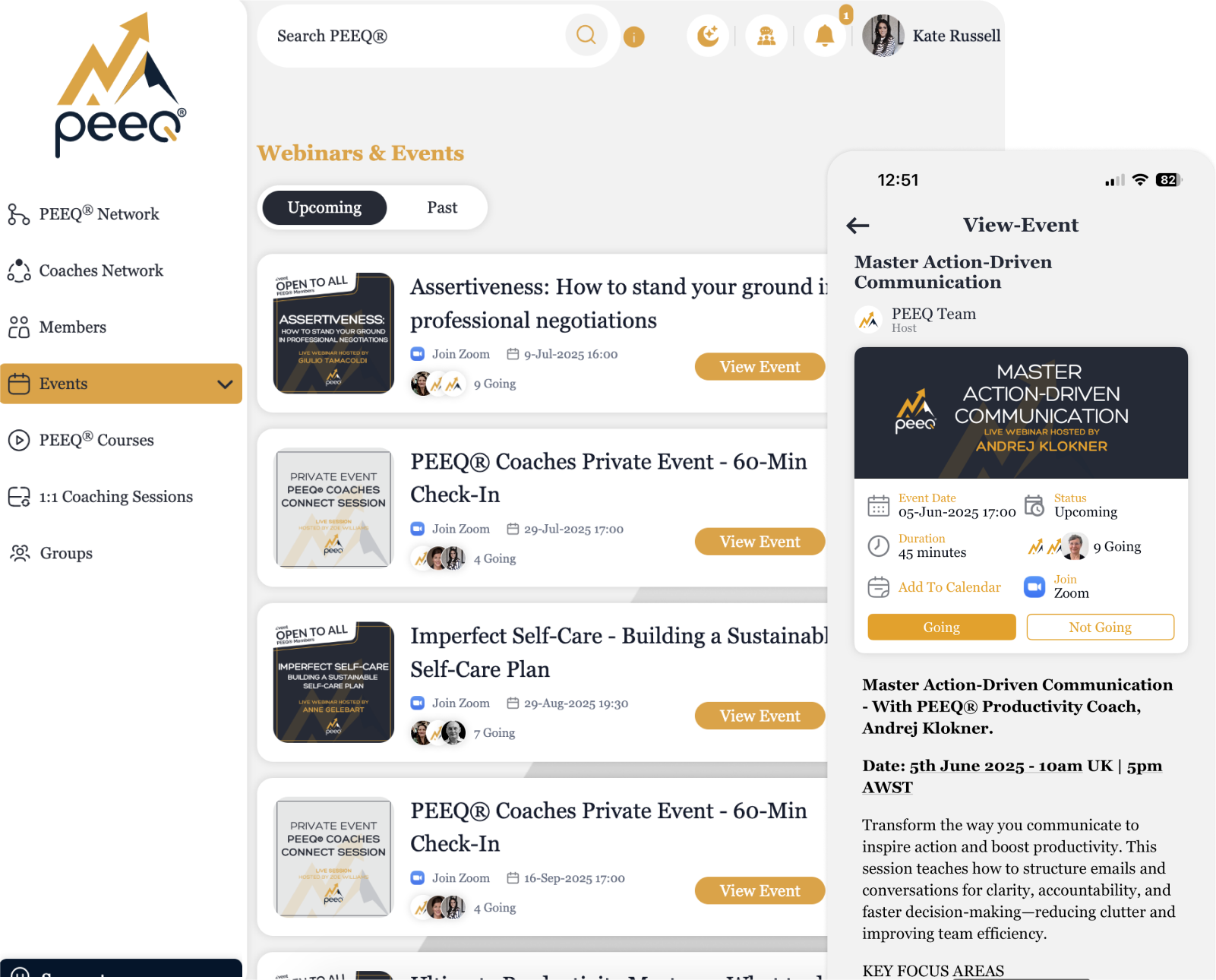 PEEQ® Live Events bring members together to inspire, connect, and accelerate personal and professional growth through interactive workshops and expert-led group coaching sessions.