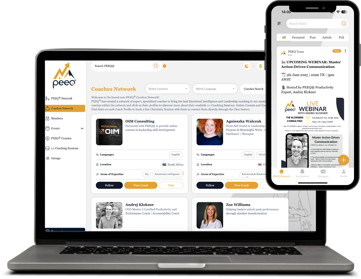 Register for a PEEQ® account to take a look around inside the platform as a member. Login via web or Download the App at your App Store. You don’t need a subscription to explore. Just dive in and see how PEEQ® can support your people and culture. Discover how easy it is to access the Coaches Network, browse the Online Programs and RSVP to our regular public events.